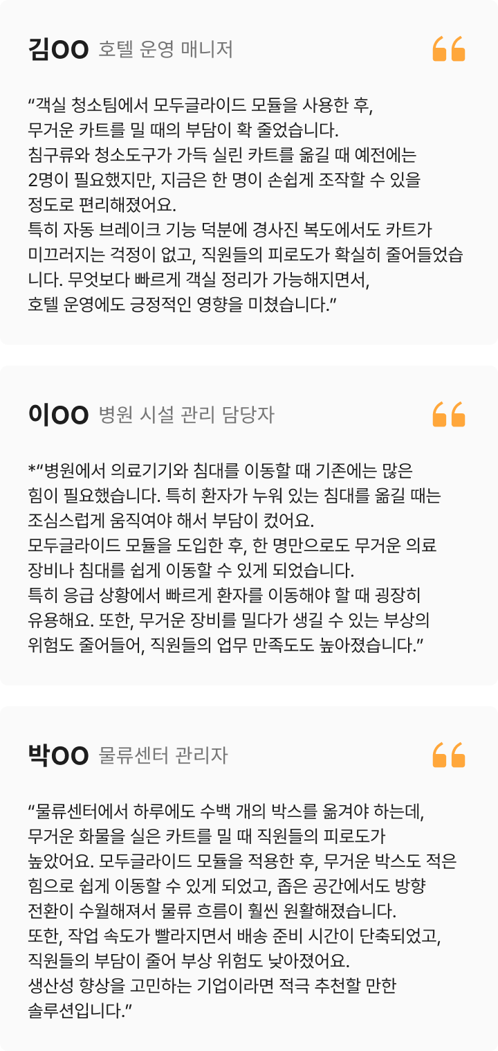 “병원에서 의료기기와 침대를 이동할 때 기존에는 많은 힘이 필요했습니다. 특히 환자가 누워 있는 침대를 옮길 때는 조심스럽게 움직여야 해서 부담이 컸어요. 모두글라이드 모듈을 도입한 후, 한 명만으로도 무거운 의료 장비나 침대를 쉽게 이동할 수 있게 되었습니다. 특히 응급 상황에서 빠르게 환자를 이동해야 할 때 굉장히 유용해요. 또한, 무거운 장비를 밀다가 생길 수 있는 부상의 위험도 줄어들어, 직원들의 업무 만족도도 높아졌습니다.”