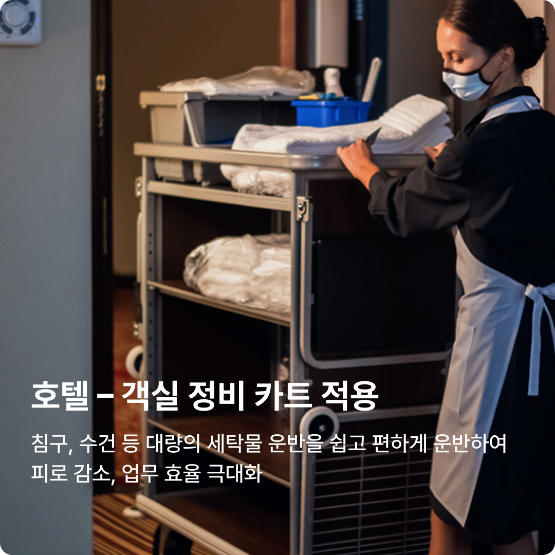 호텔 – 객실 정비 카트 적용 침구, 수건 등 대량의 세탁물 운반을 쉽고 편하게 운반하여