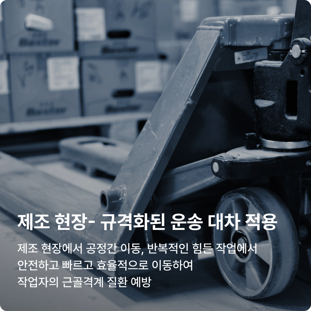 제조 현장 – 규격화된 운송 대차 적용 제조 현장에서 공정간 이동, 반복적인 힘든 작업에서 안전하고 빠르고 효율적으로 이동하여 작업자의 근골격계 질환 예방