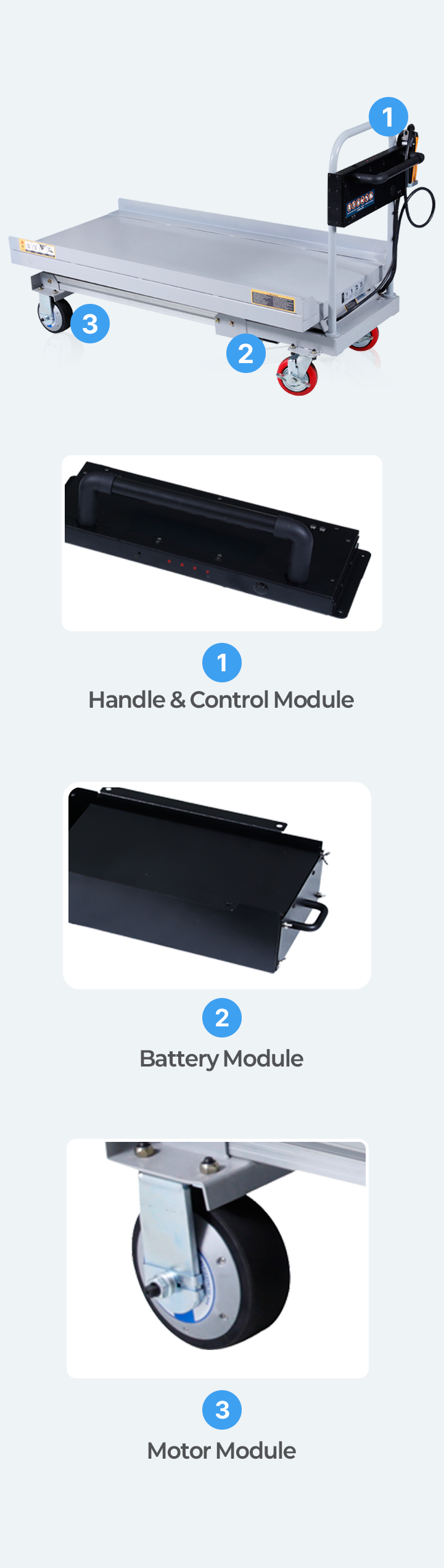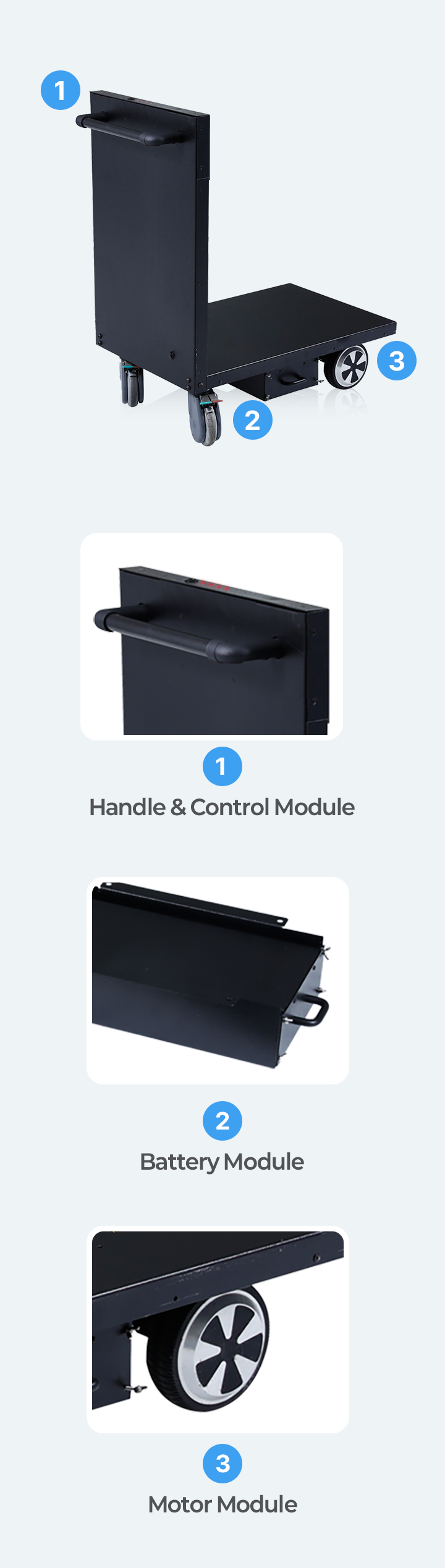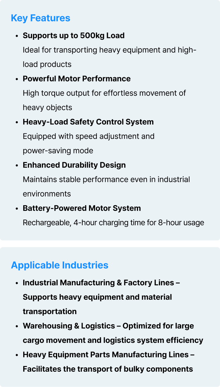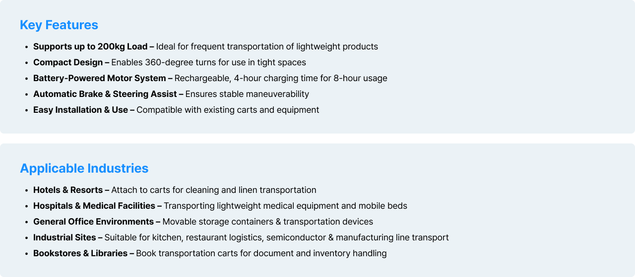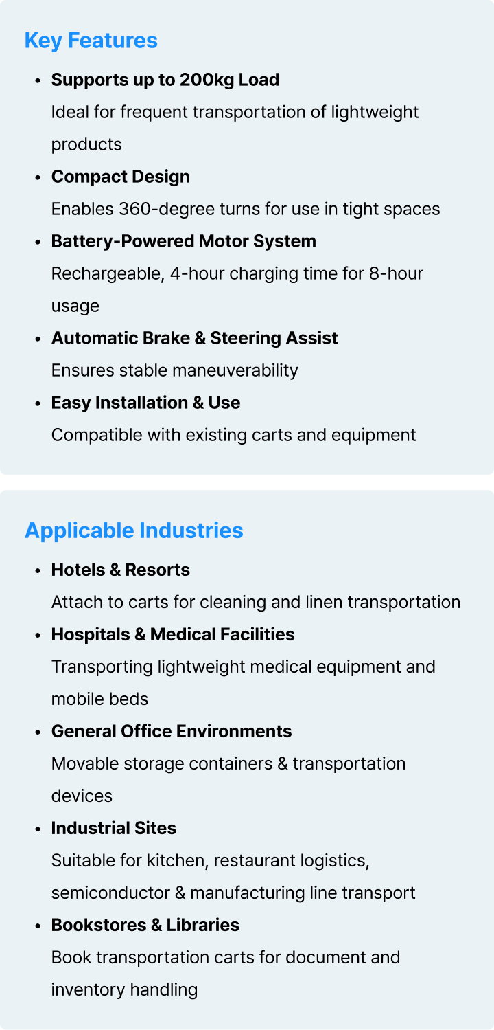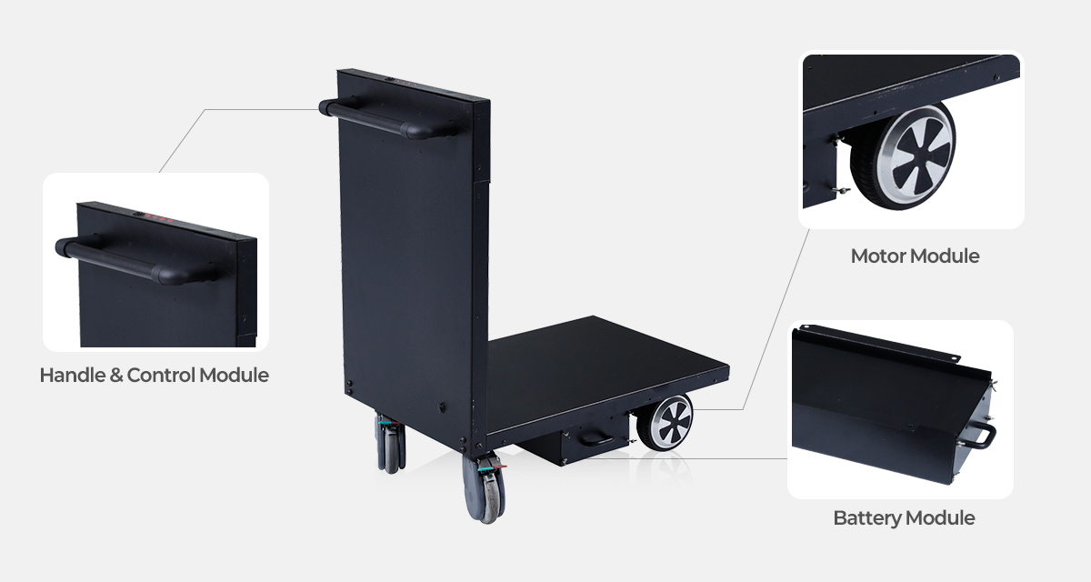 By integrating the Handle KIT, Drive Motor KIT, and Battery KIT into your existing equipment, MODUGLIDE comes to life.