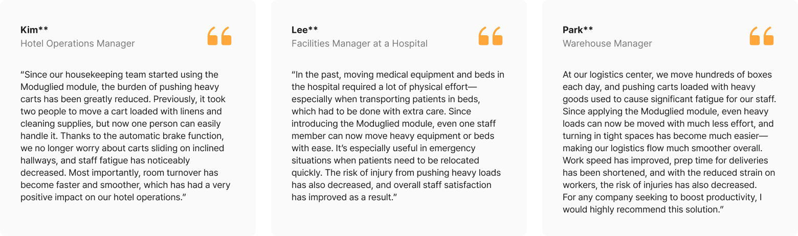 “At our logistics center, we move hundreds of boxes each day, and pushing carts loaded with heavy goods used to cause significant fatigue for our staff. Since applying the Moduglied module, even heavy loads can now be moved with much less effort, and turning in tight spaces has become much easier—making our logistics flow much smoother overall. Work speed has improved, prep time for deliveries has been shortened, and with the reduced strain on workers, the risk of injuries has also decreased. For any company seeking to boost productivity, I would highly recommend this solution.”